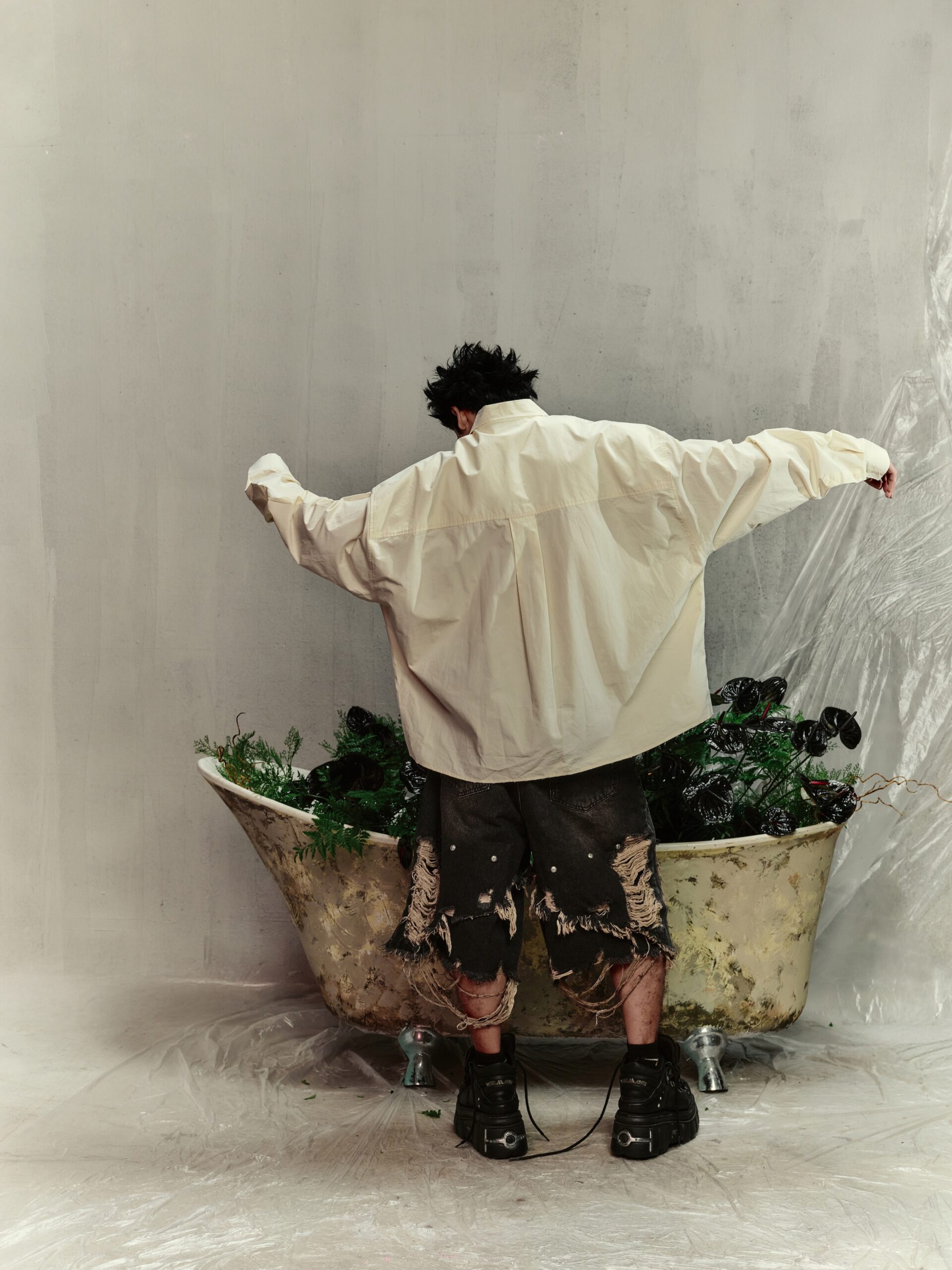 Material: Premium cotton – soft and lightweight yet structured enough to hold its form, breathable for everyday wear. Silhouette: Oversized fit with dropped shoulders, wide long sleeves, and a naturally draped body for a relaxed feel.Color: Off-white / Cream. Size: 1 (S–M), 2 (L–XL)