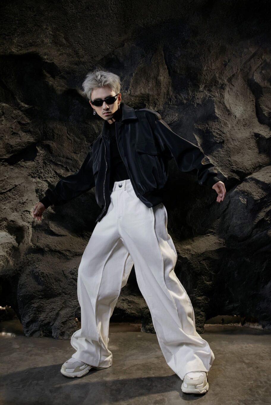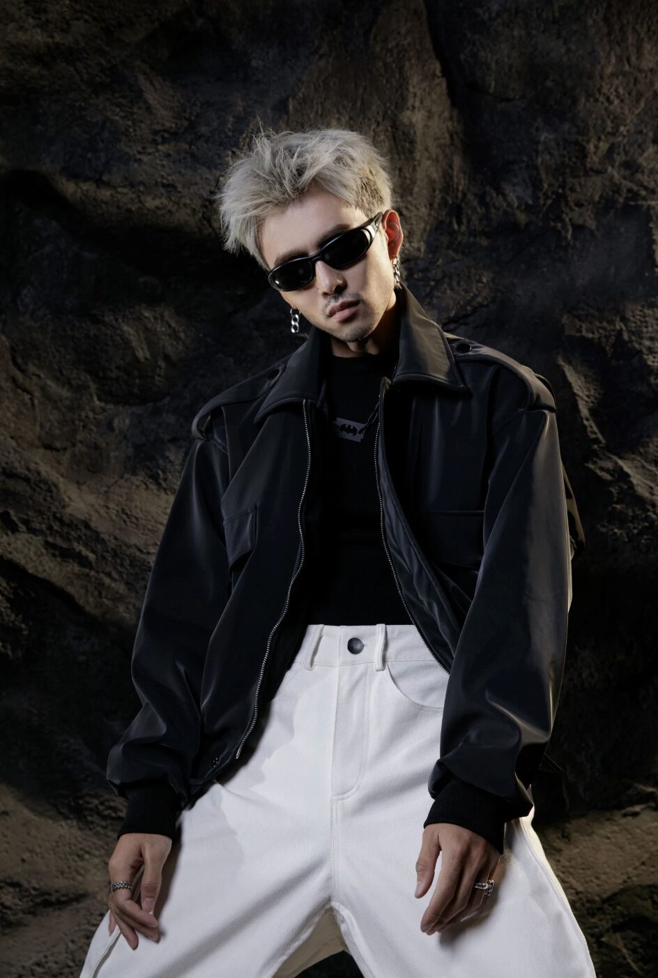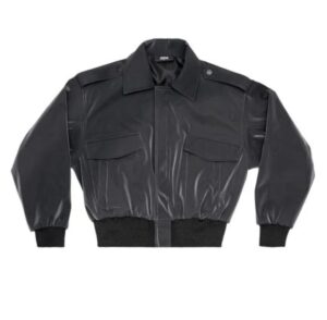 Oversize. Cropped. Hide snap button at zipper placket. Silk lining inside. Matte reflective faux leather (stretchable).