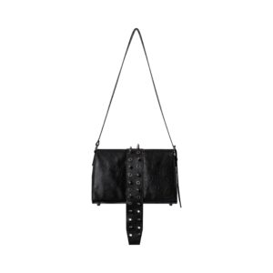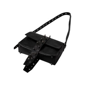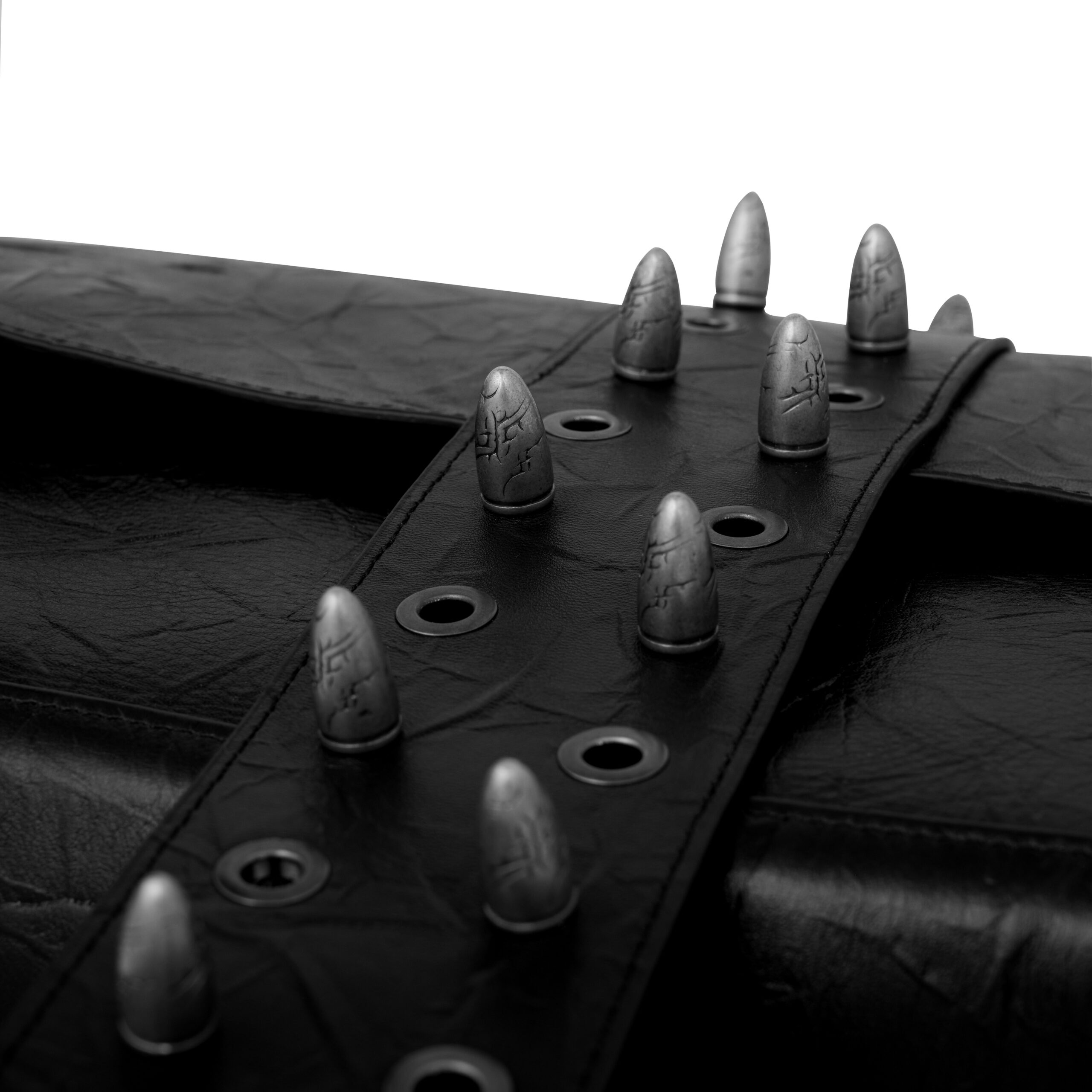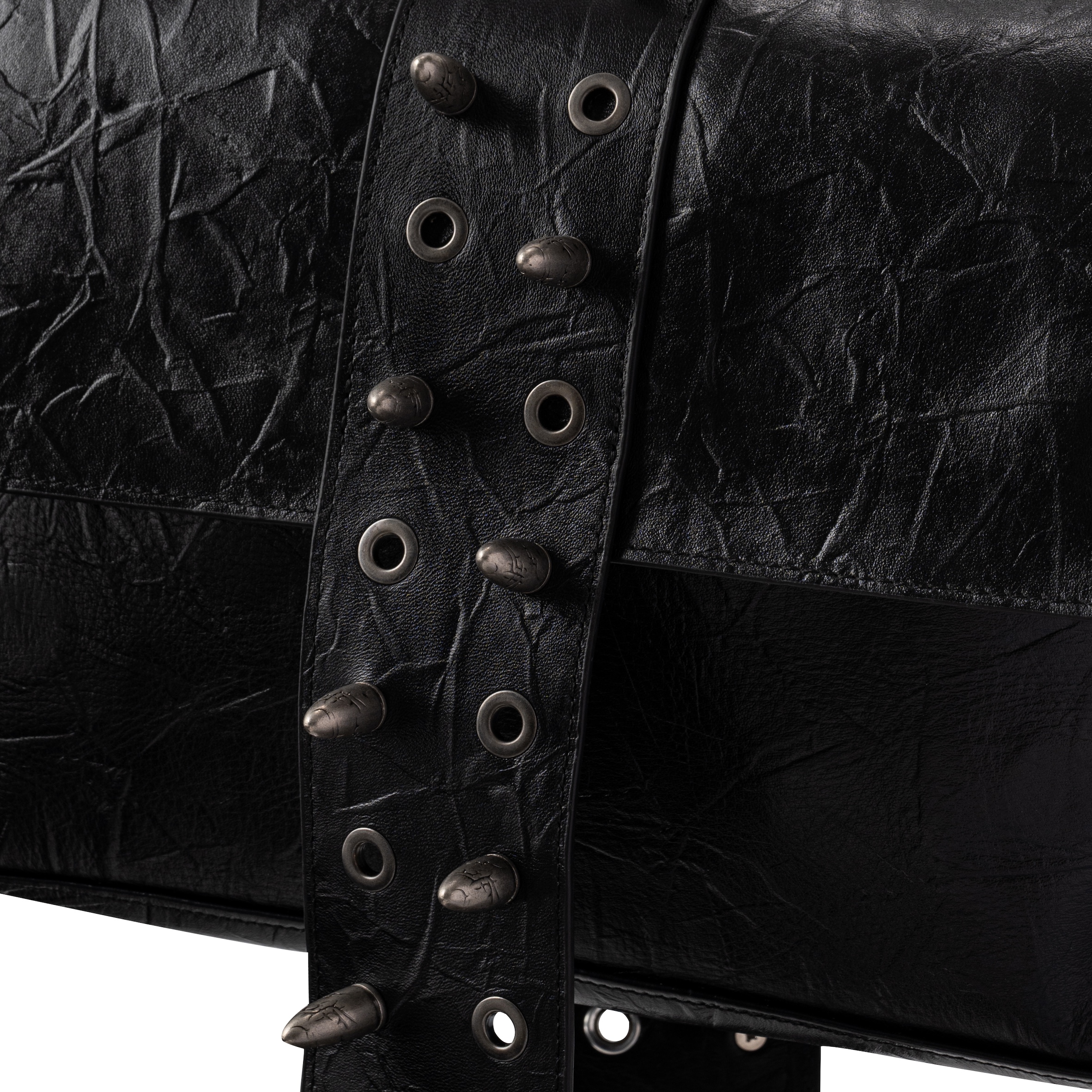 Material: Wrinkled-texture real leather. Color: Jet black. Shape: Structured rectangular design. Feature: Wide strap with cone-shaped metal studs. Strap: Adjustable with metal eyelet embellishment. Style: Rock-chic, Punk-inspired, Gothic streetwear