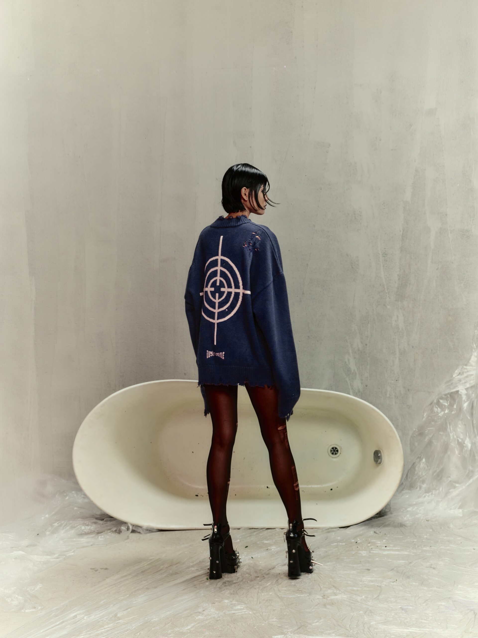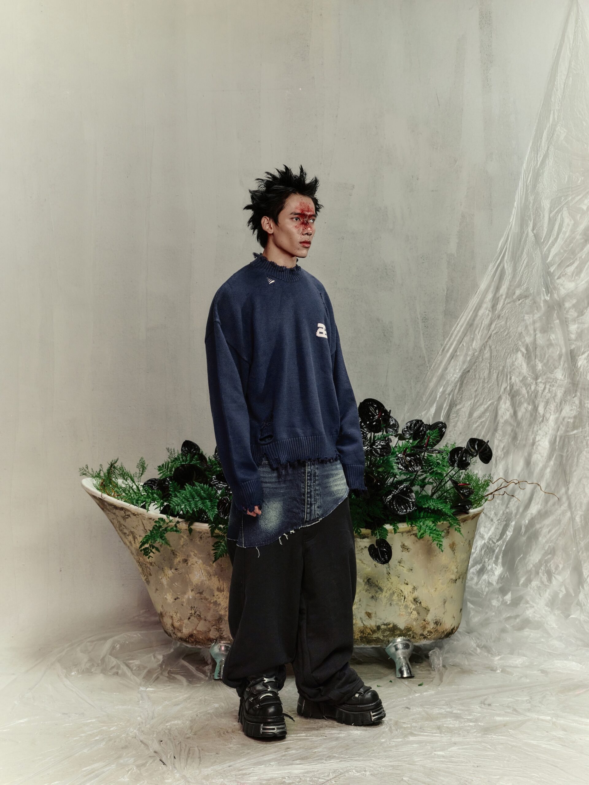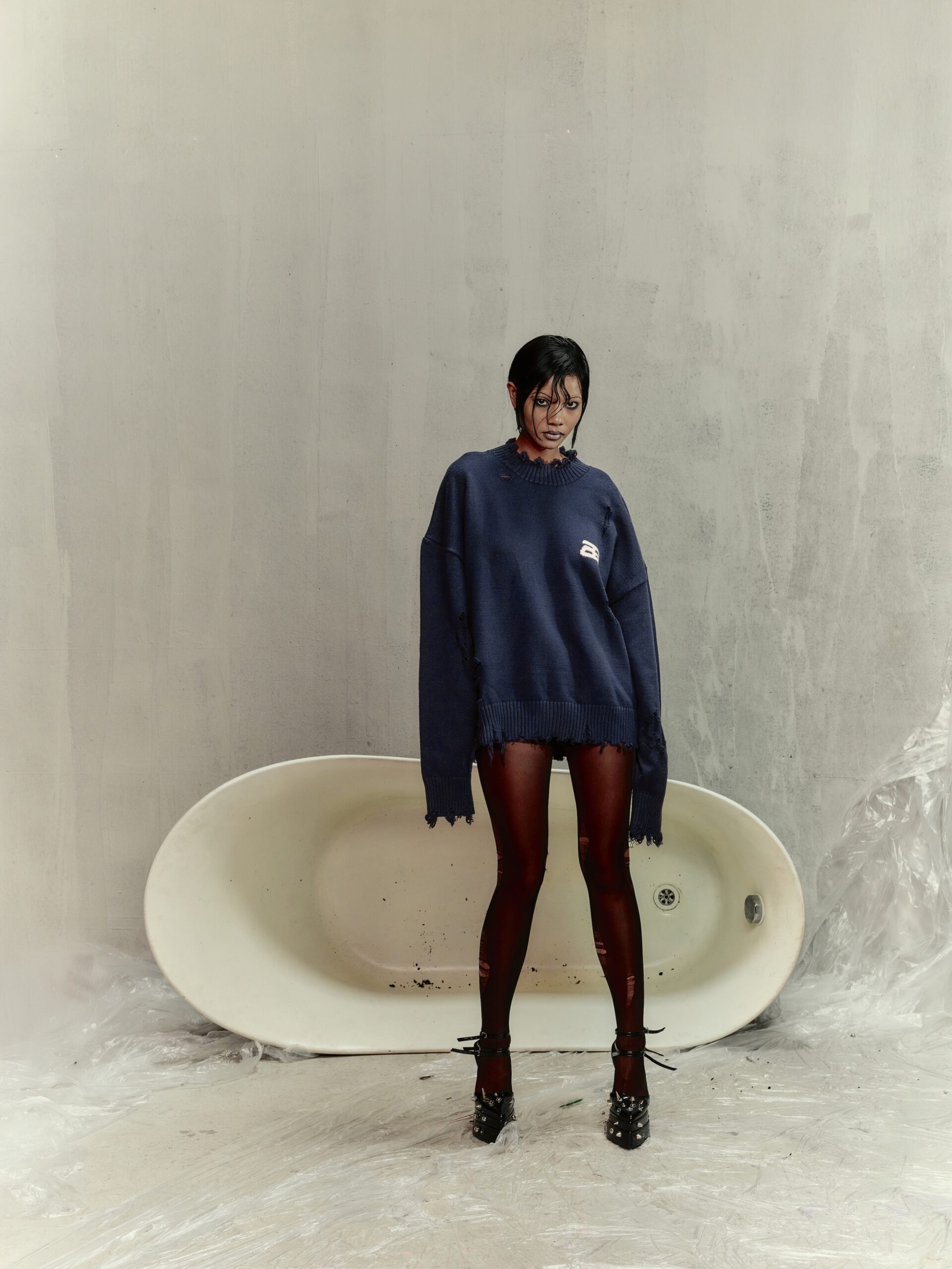 Material: Premium knit fabric. Fit: Long-sleeve crop top, waist-length. Design: Distinctive distressed details paired with intricate handcrafted embroidery. Style: Bold streetwear – perfect for casual outings, light parties, or photo shoots
