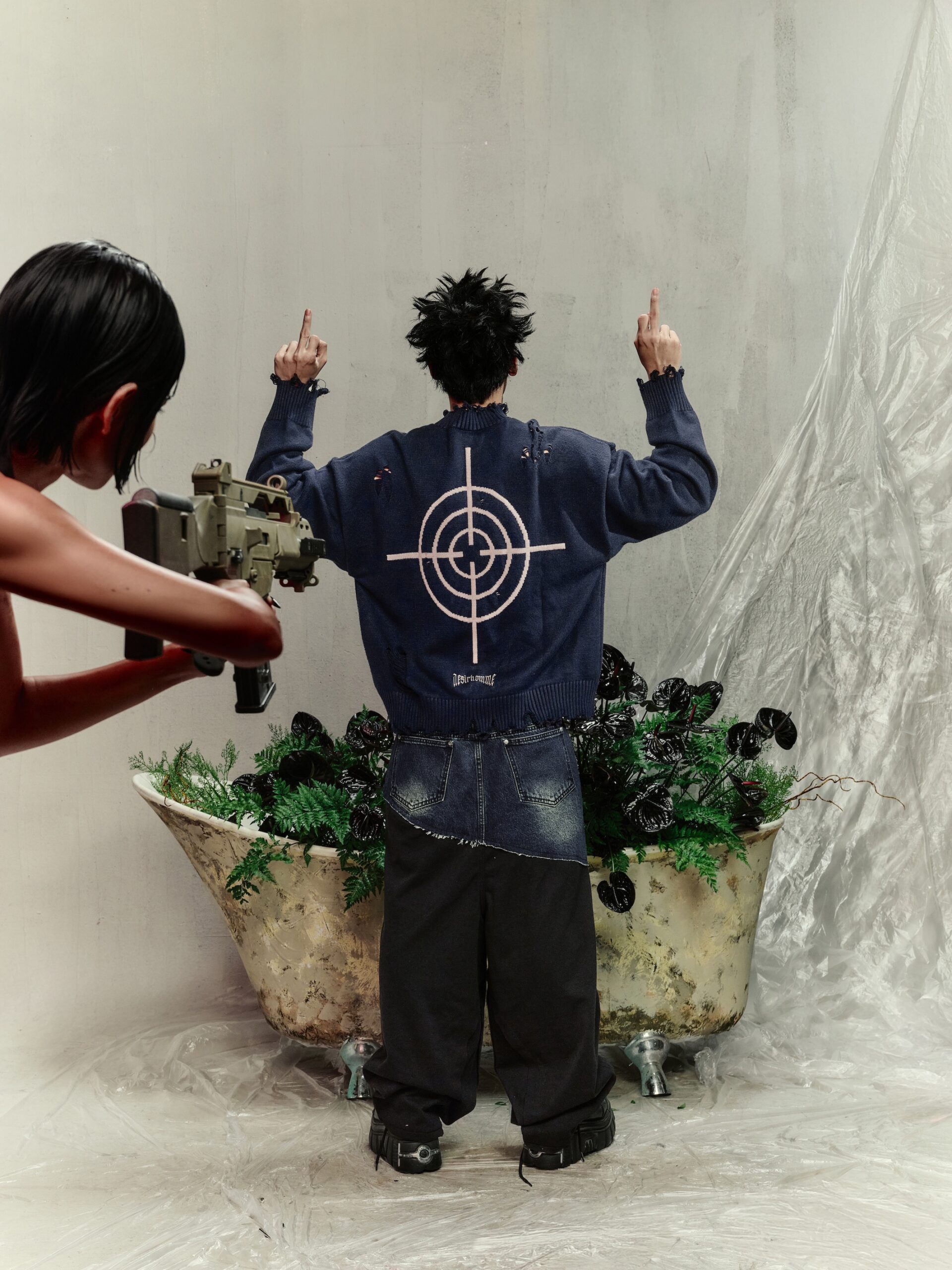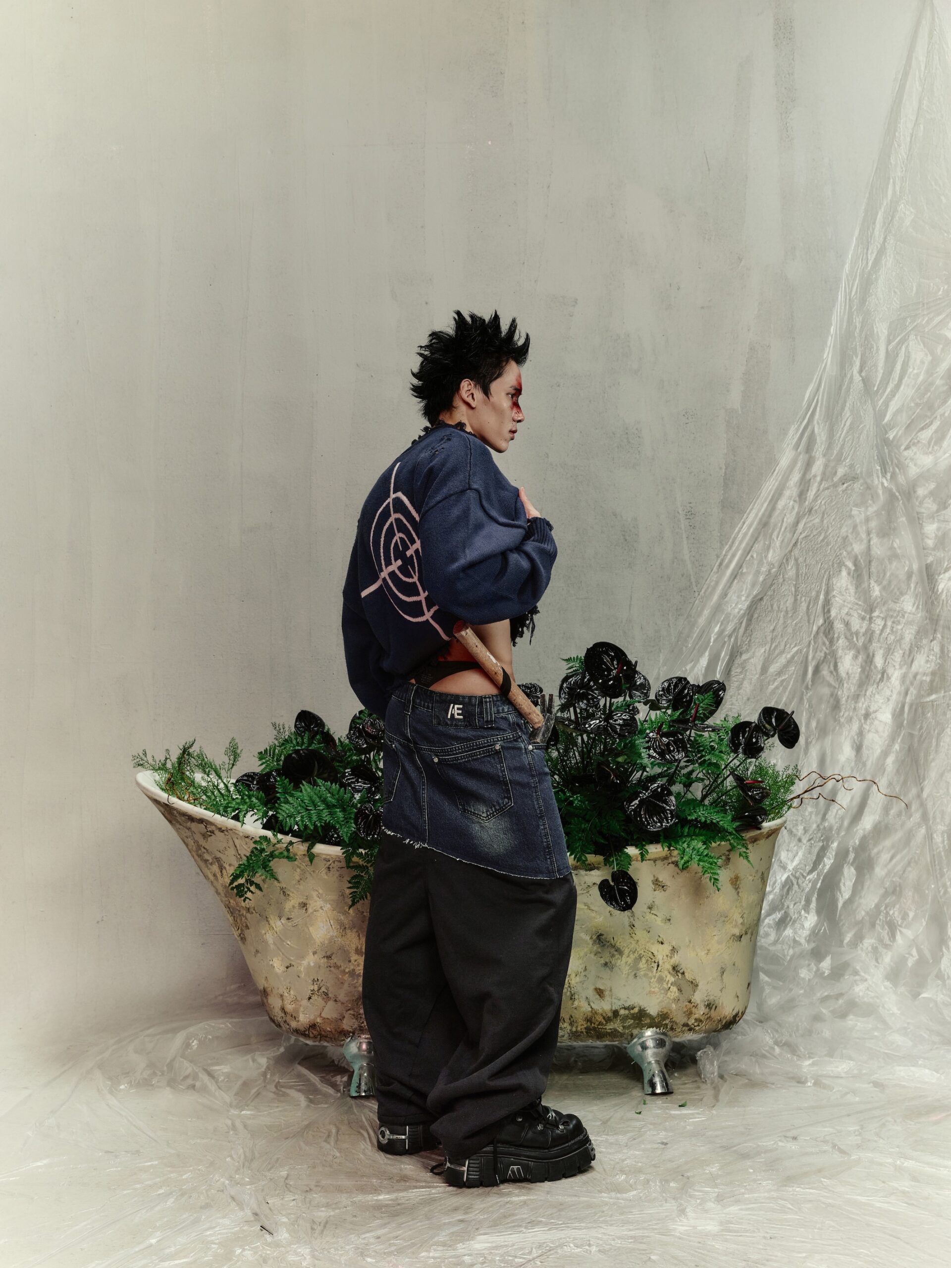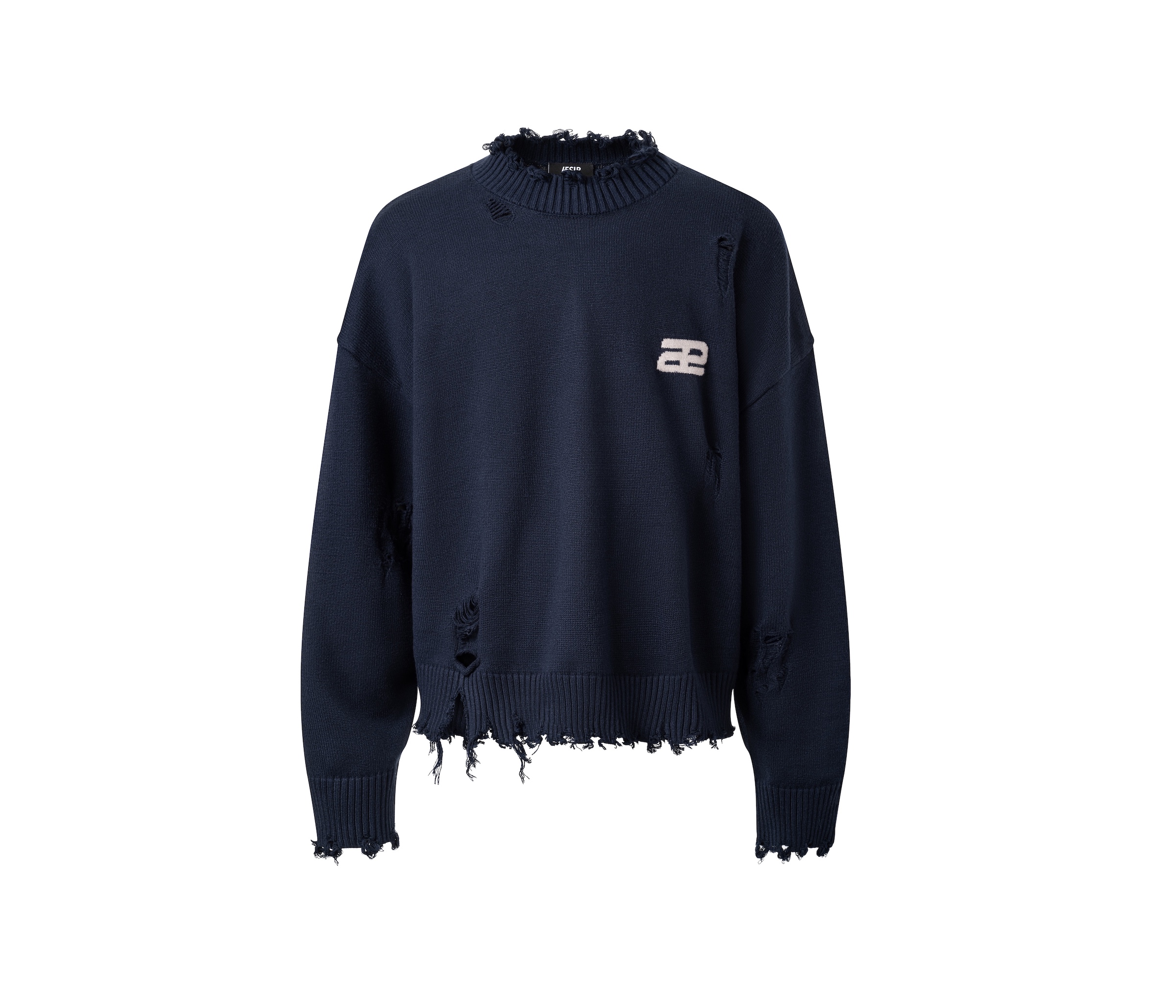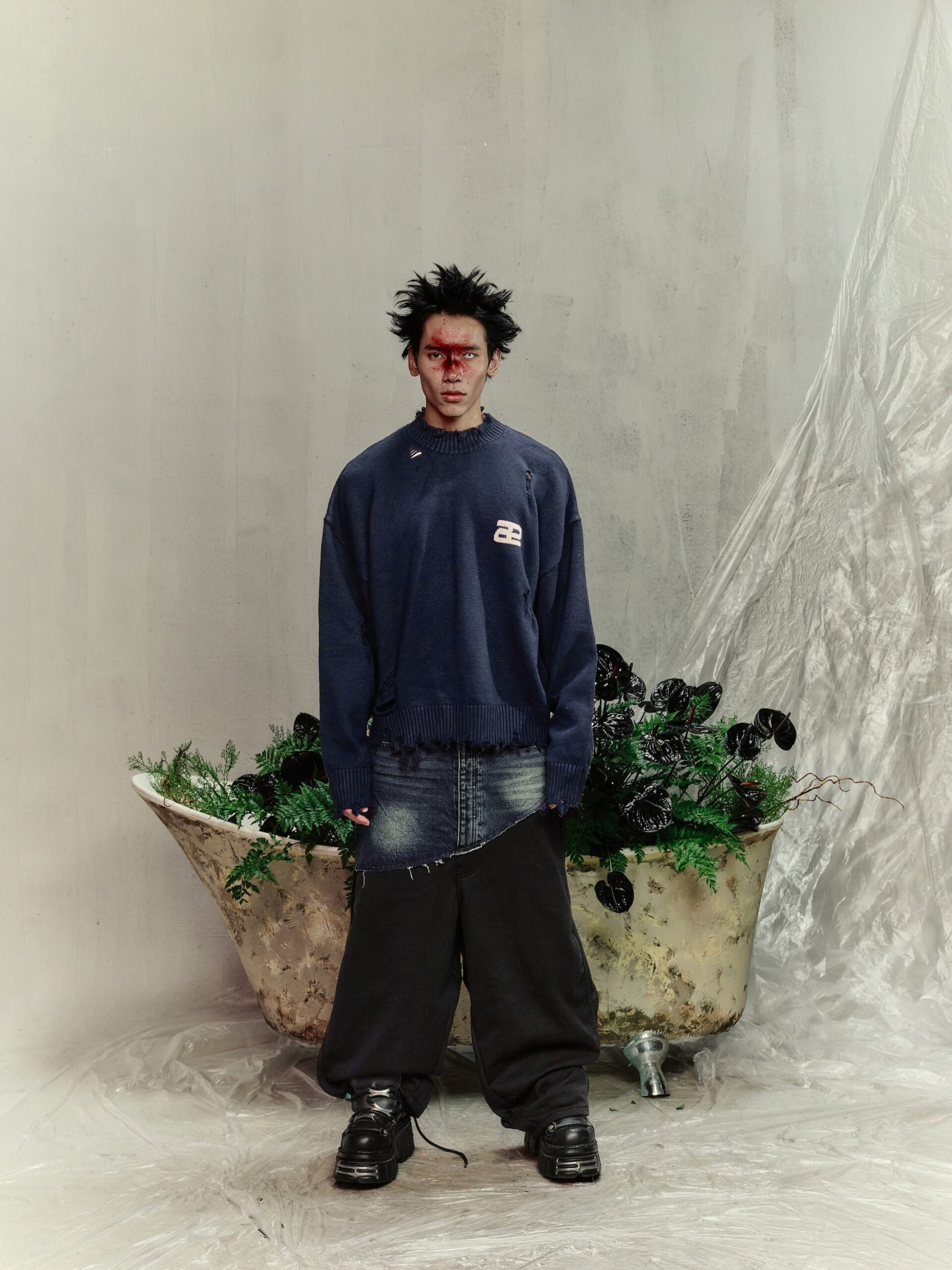 Material: Premium knit fabric. Fit: Long-sleeve crop top, waist-length. Design: Distinctive distressed details paired with intricate handcrafted embroidery. Style: Bold streetwear – perfect for casual outings, light parties, or photo shoots