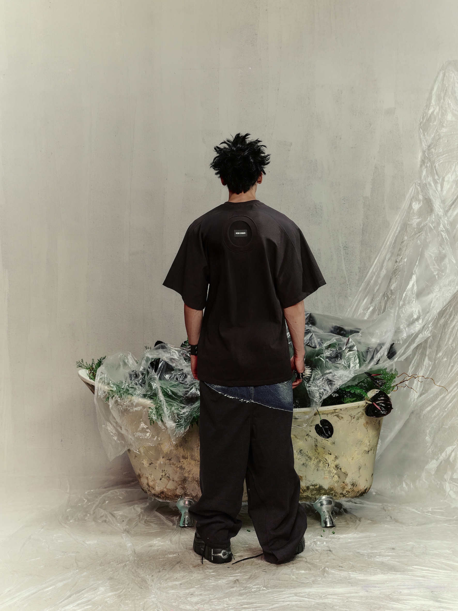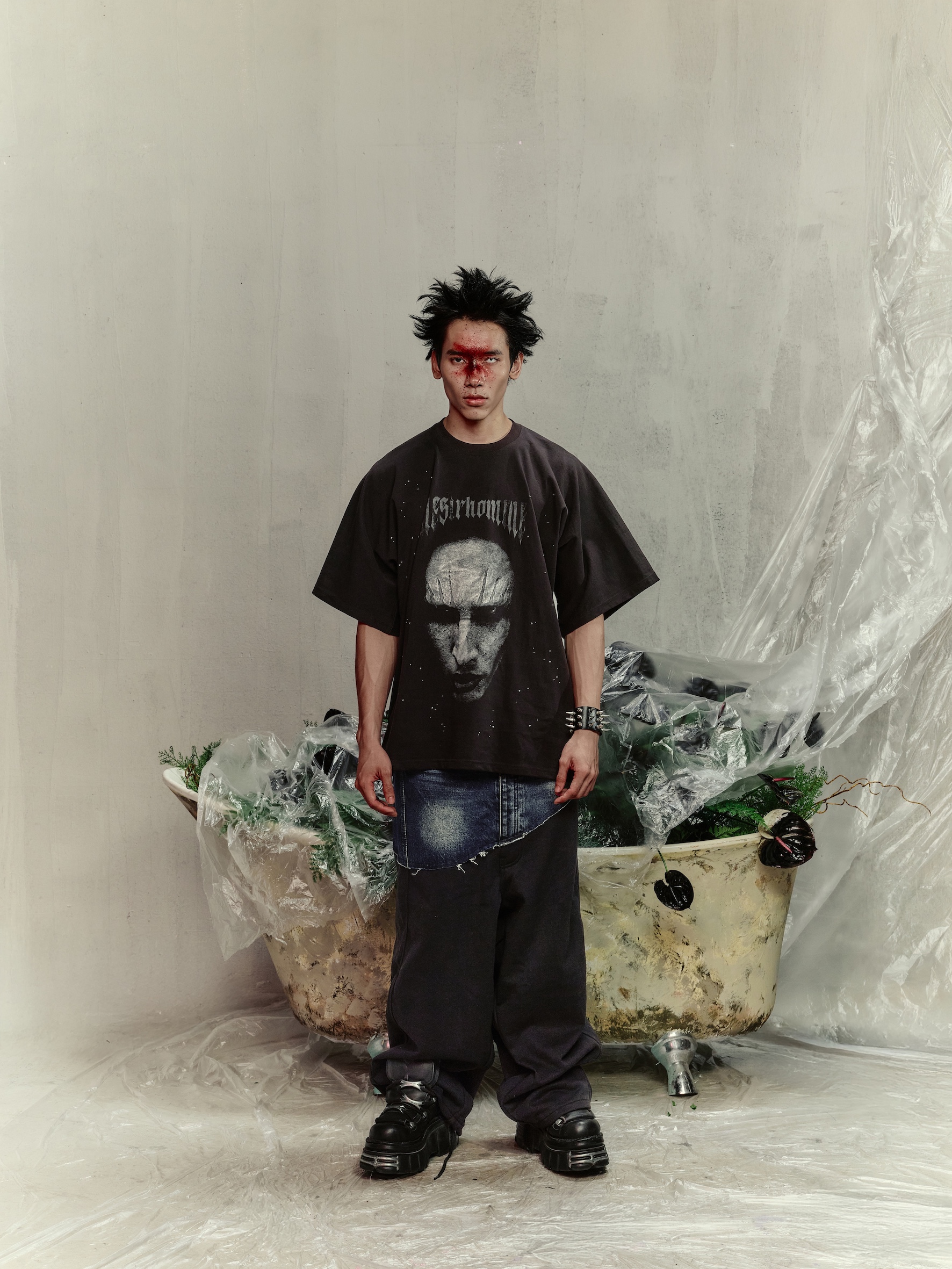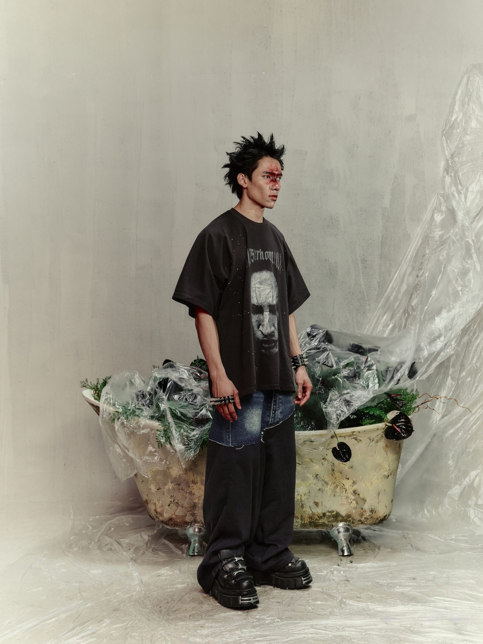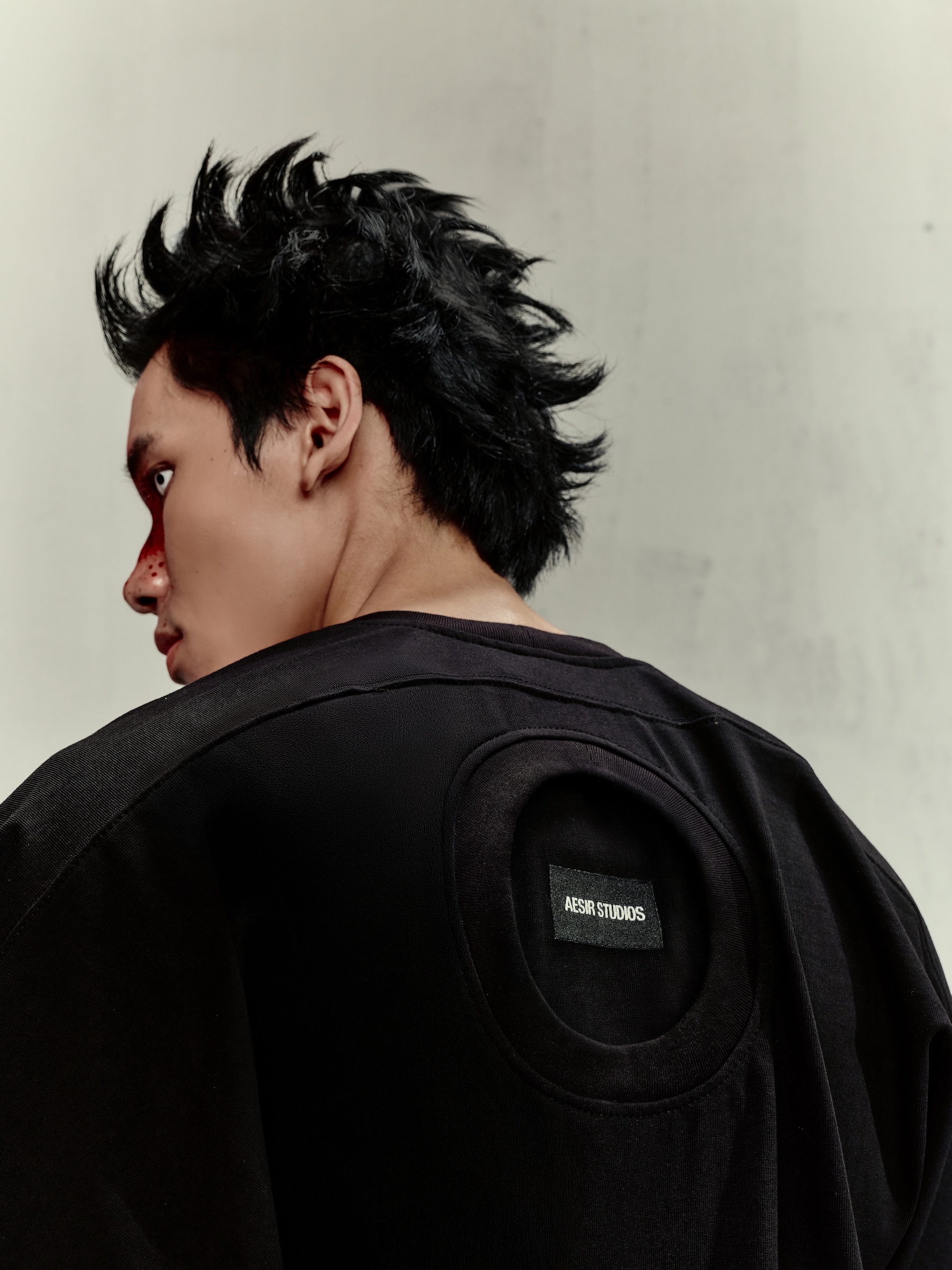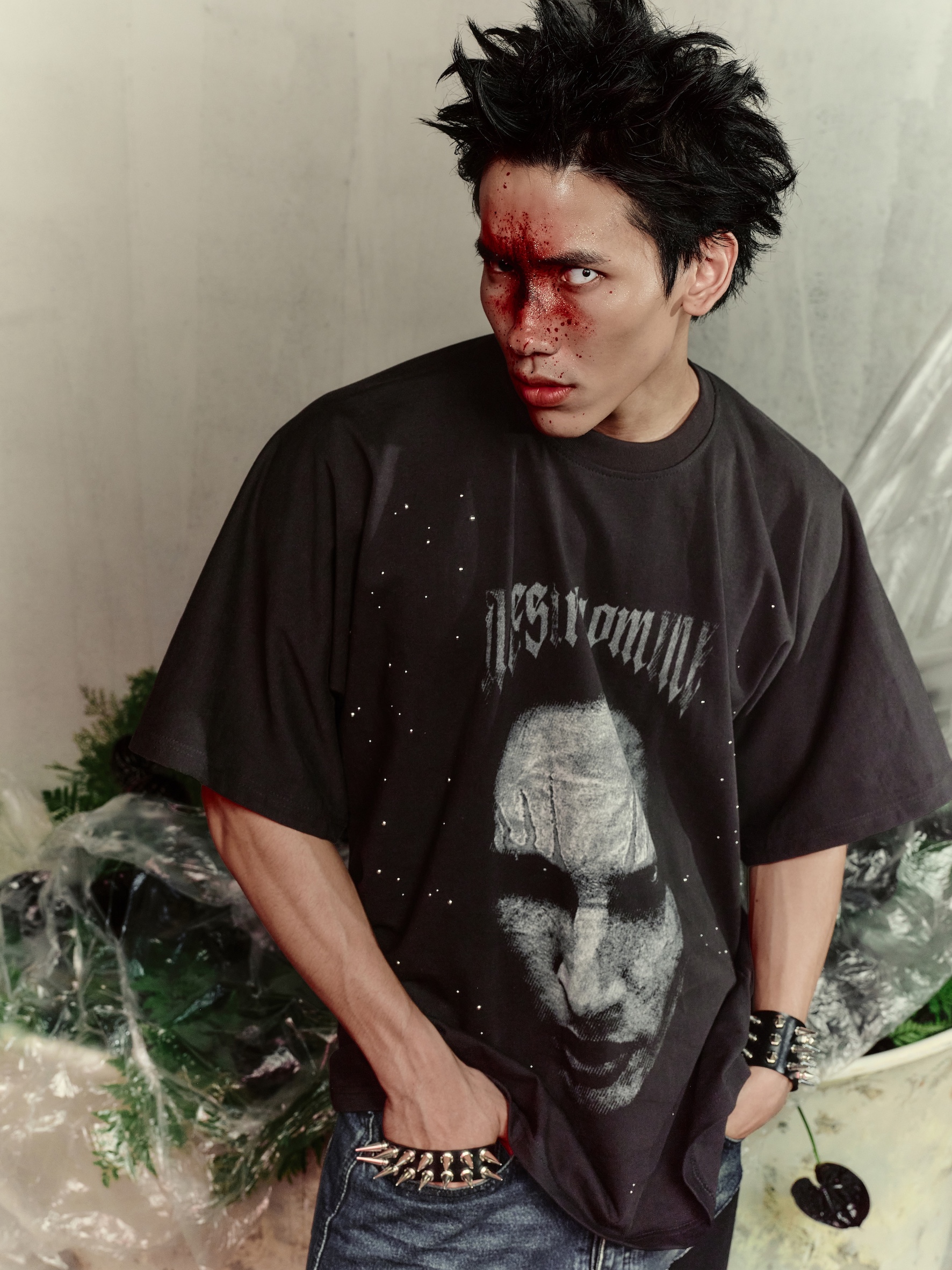 Style: Darkwear / Art Punk – pairs well with structured trousers, asymmetric skirts, or layered over a long-sleeve top for an expressive look.