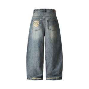 Material: Cotton Denim. Fit: Wide-leg, straight cut with a mid-rise waist. Details: Intricately distressed by hand for a rugged, authentic look. Hidden camo layer subtly revealed beneath the ripped denim – a signature deconstructed twist. Color: Washed Blue Size: 1 (S), 2 (M), 3 (L)