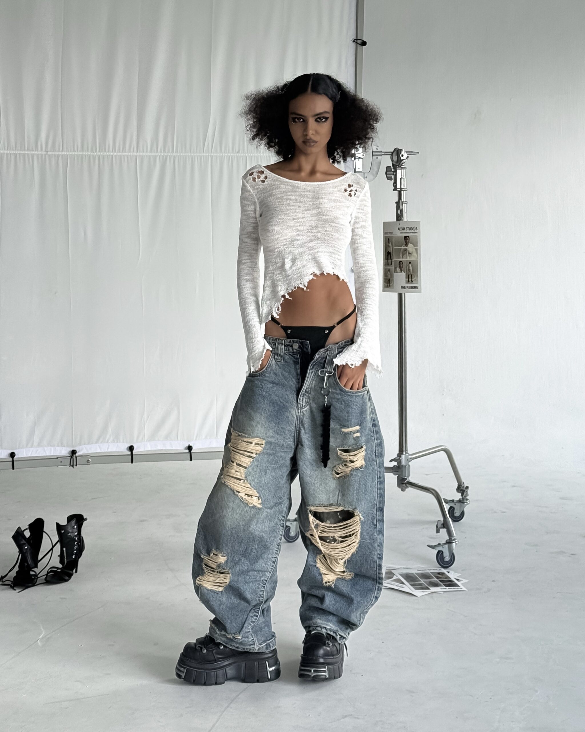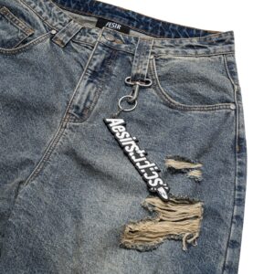 Details: Intricately distressed by hand for a rugged, authentic look. Hidden camo layer subtly revealed beneath the ripped denim – a signature deconstructed twist.