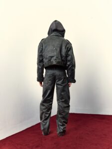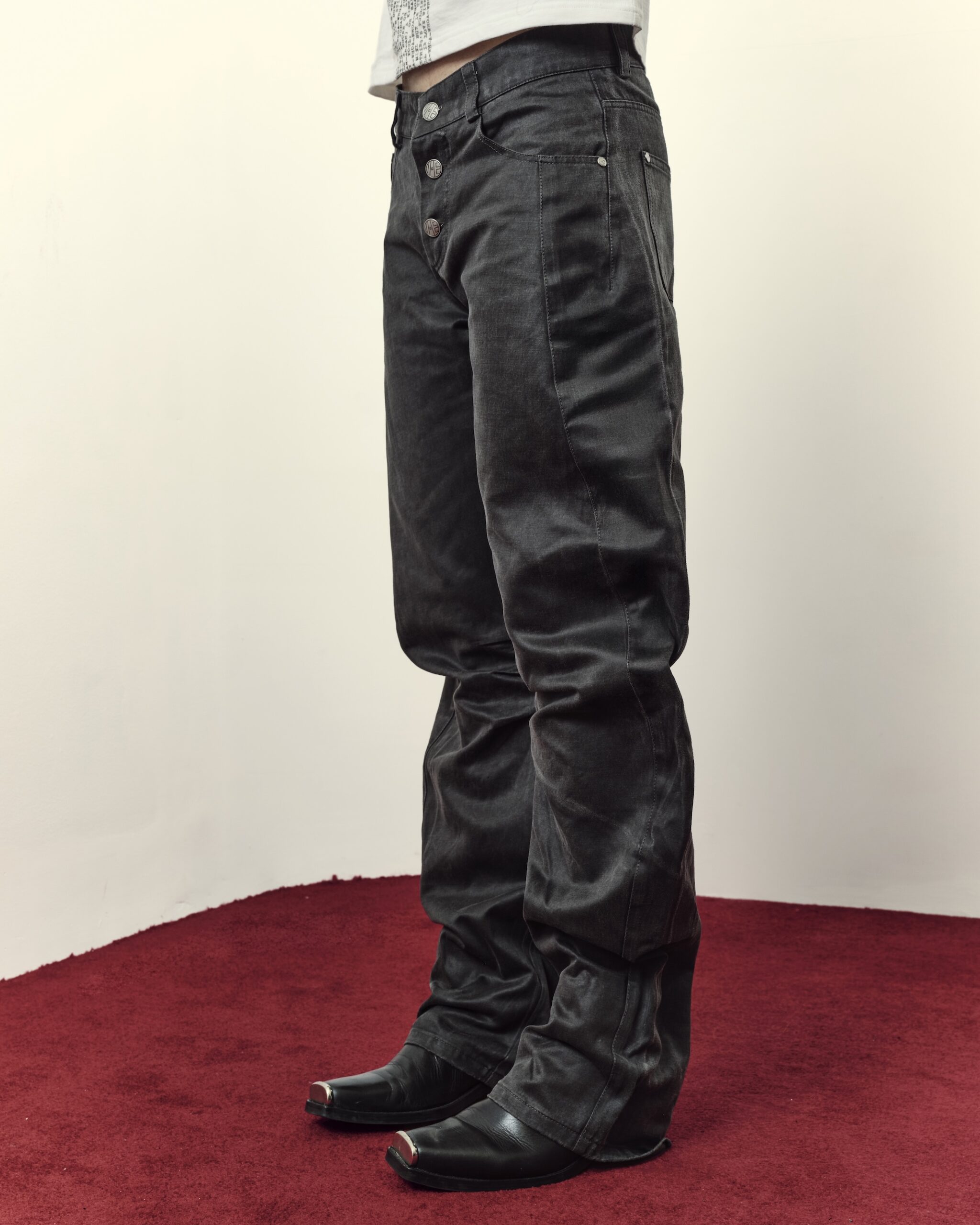 High-rise waist with exposed metal button closure, adding a strong industrial and vintage accent.
