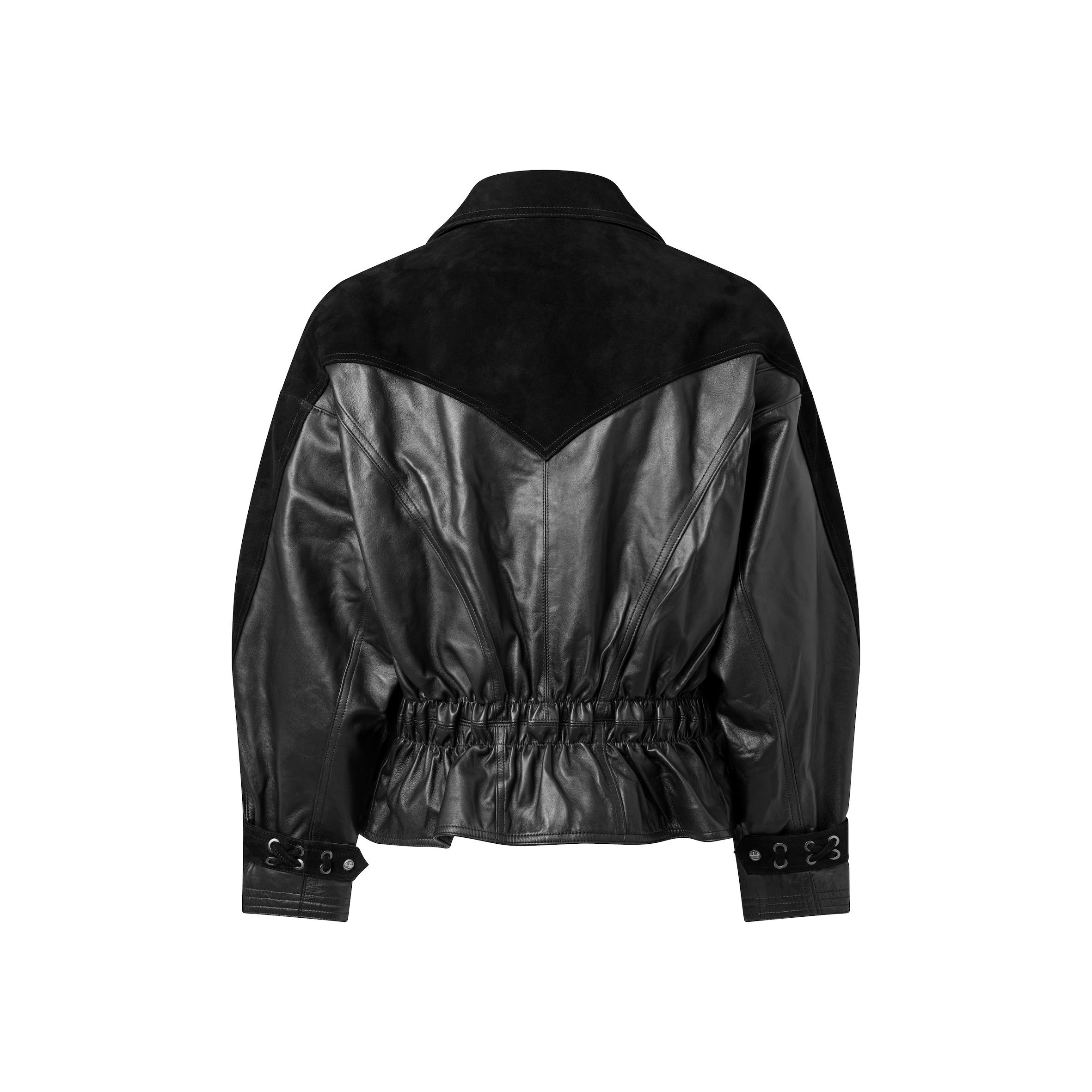 Material: Full-grain genuine cowhide leather – durable and richly textured. Silhouette: Structured regular fit with an elastic back waistband for a subtle cinch at the waist. Color: Black