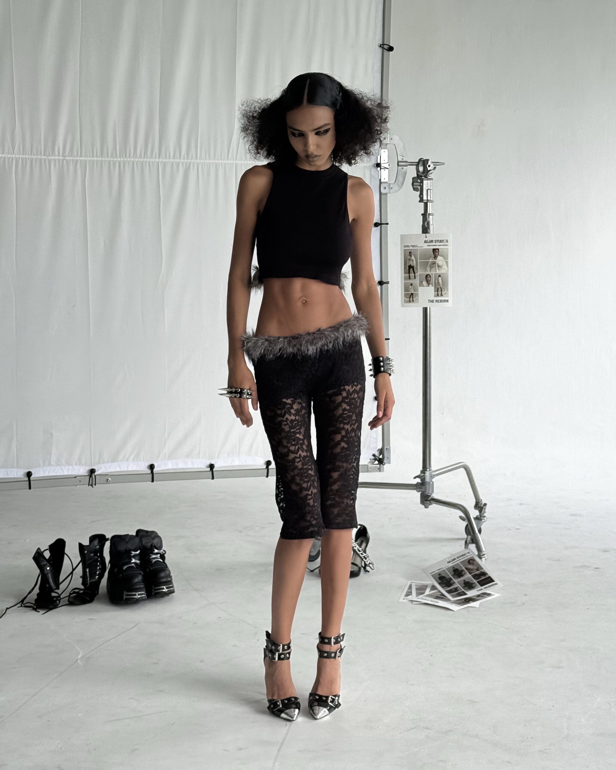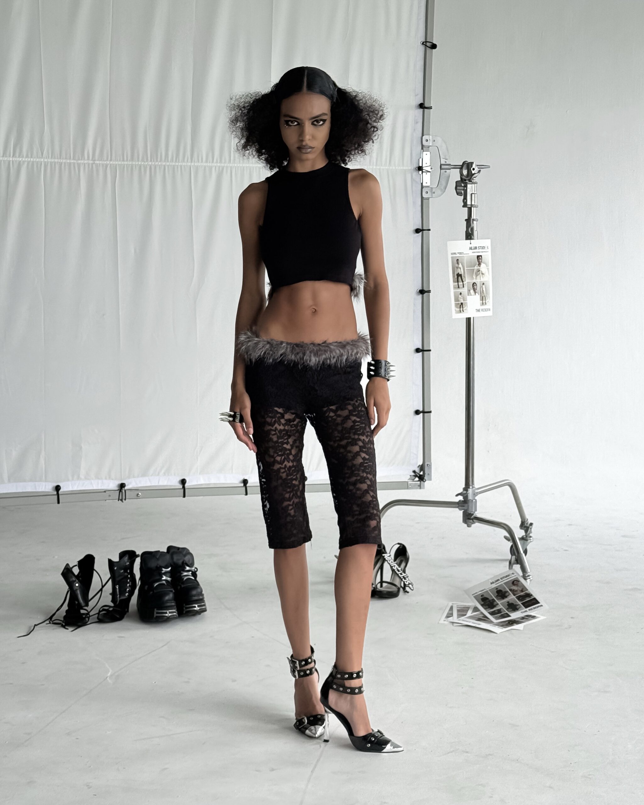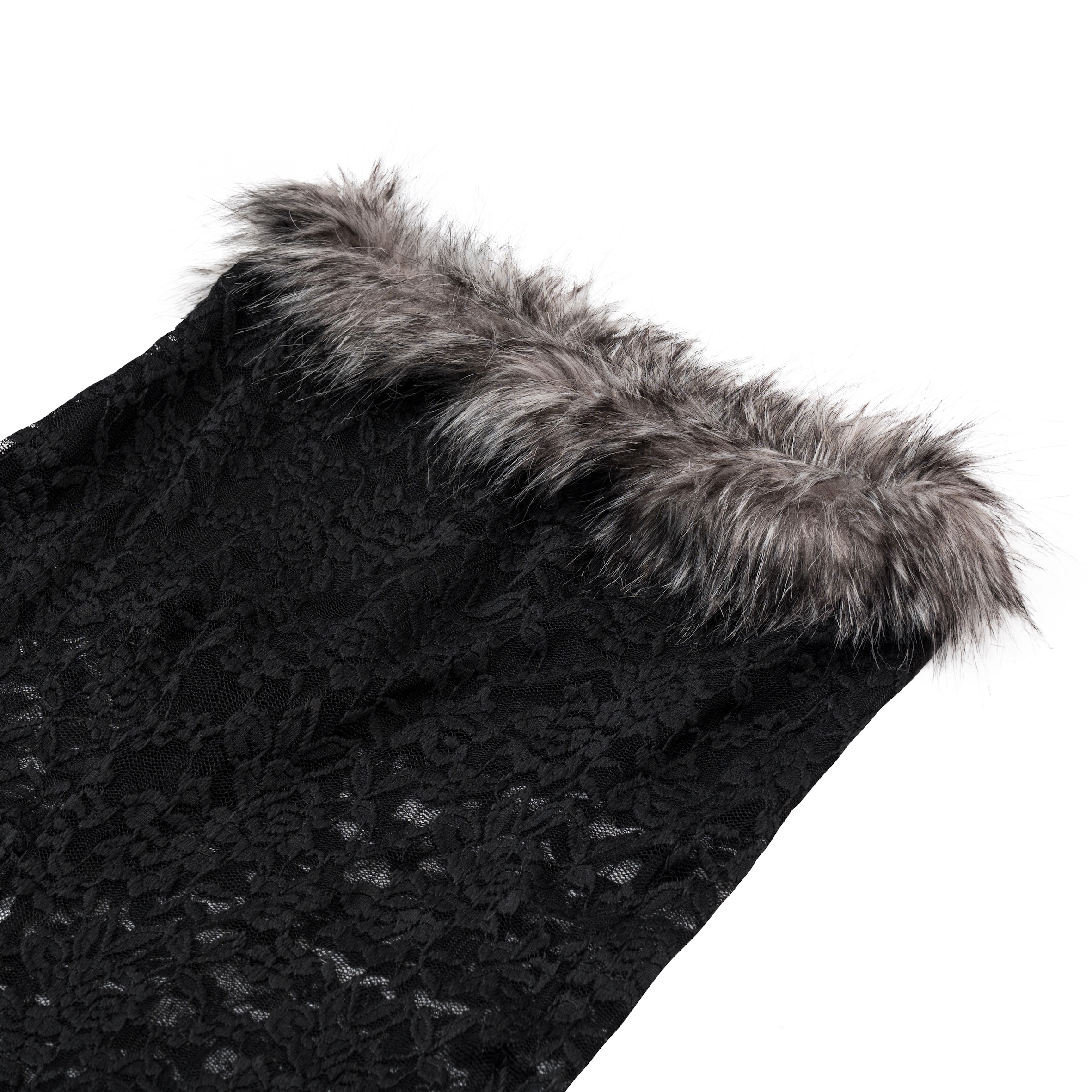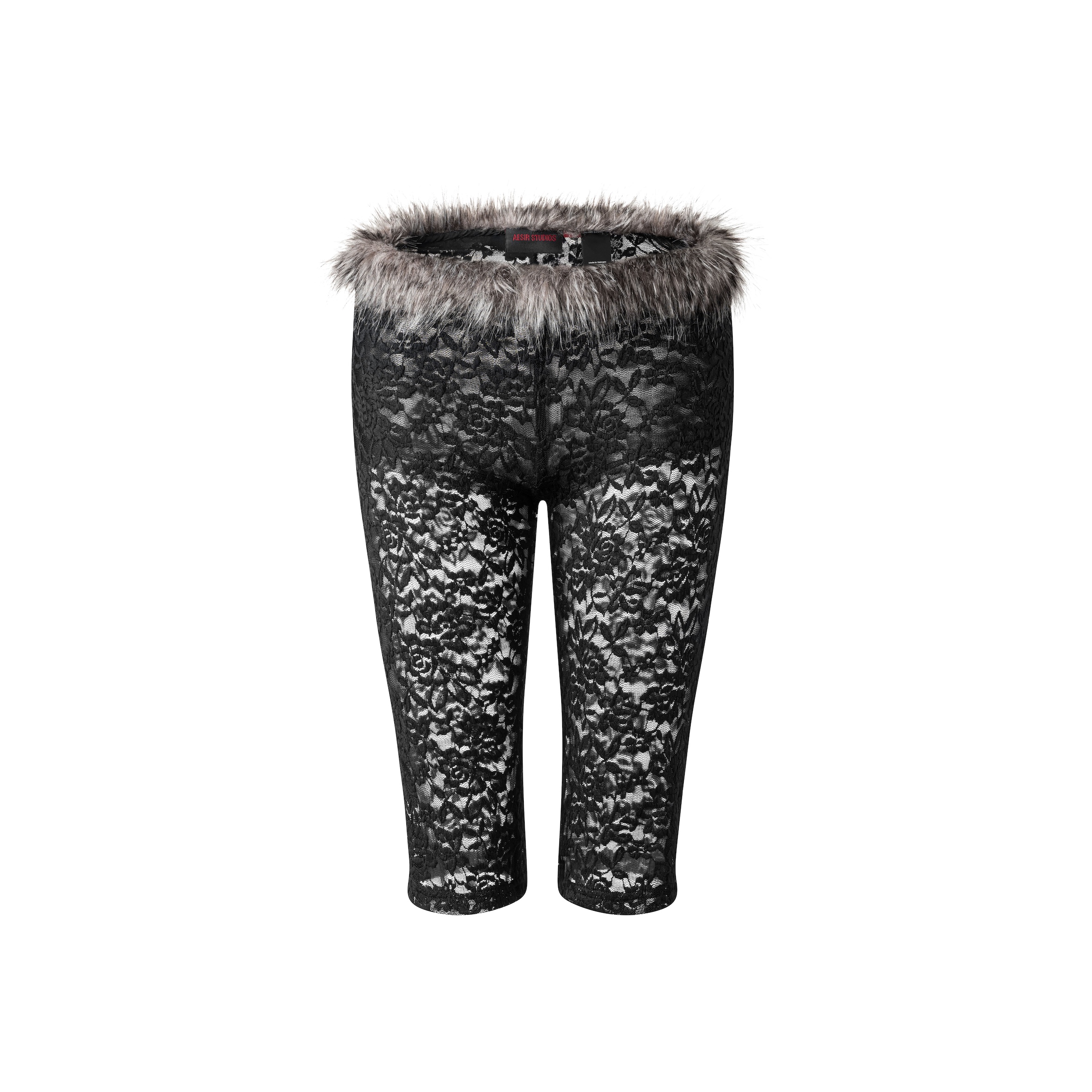 Mid-calf length fitted pants that hug the body and highlight your shape. Sheer black floral lace – sexy yet tasteful. Grey faux fur waistband for a bold, luxe accent. Large floral lace pattern – stylish and edgy. Pair with studded heels, metal accessories for a Y2K punk-rock vibe. Color: Black. Sizes: 1 (S–M), 2 (L–XL)
