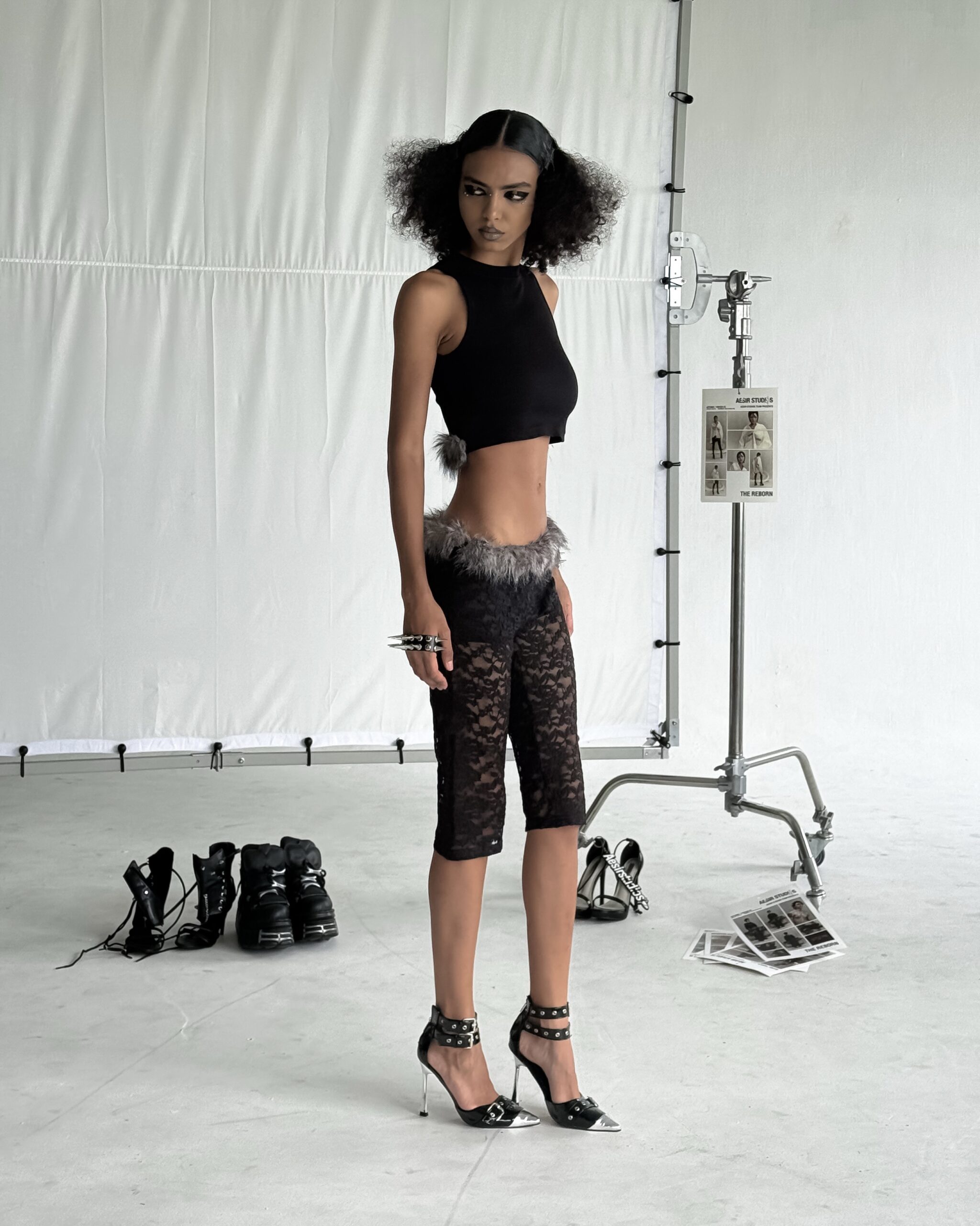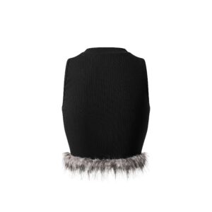 Cropped slim-fit tank top with smoky grey faux fur trim. Ribbed stretch fabric – soft, breathable, comfy. Wide armholes, round neck – bold & flattering. Black color, easy to mix & match. Style: Y2K × Minimalist. Wear it for: Casual outings, parties, streetstyle looks. Color: Black | Sizes: 1 (S), 2 (M), 3 (L)