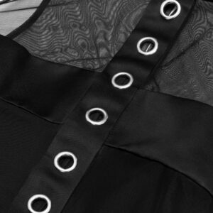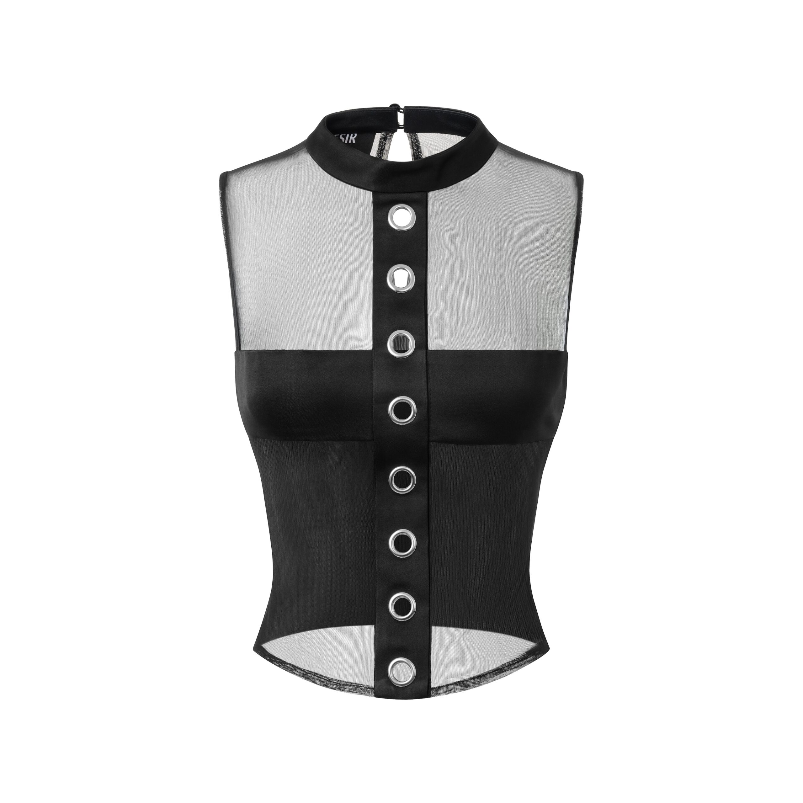 Material: Sheer mesh fabric combined with matte satin panels. Silhouette: Body-hugging fit that flatters the waist. Subtly curved hemline enhances the illusion of longer legs. Details: Light mock neck with a back clasp detail for a sleek finish. Bold satin panel runs down the front, adorned with circular metal eyelets for a striking contrast. Hidden clasp at the back keeps the fit secure and refined. Style: Cyber Femme / Edgy Eveningwear – perfect when paired with mesh skirts, wide-leg trousers, or layered under a structured blazer. Size: 1 (S), 2 (M), 3 (L) Color: Black